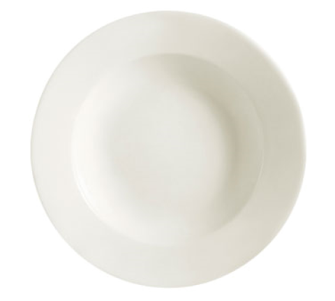 REC Soup Plate, 10 oz., 9" dia. x 2"H, round, rimmed, rolled edge, dishwasher, oven and microwave safe, stoneware (ceramic), American White (Sold by case)