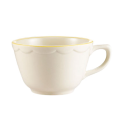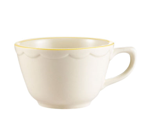 Seville Coffee Cup, 7 oz., 3-3/4" dia. x 2-3/8"H, round, tall, scallop edge, dishwasher and oven safe, stoneware (ceramic), Gold Band/American White (Sold by case)