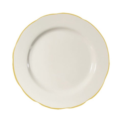 Seville Plate, 9" dia. x 1-1/8"H, round, scallop edge, dishwasher and oven safe, stoneware (ceramic), Gold Band/American White (Sold by case)