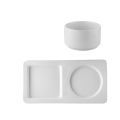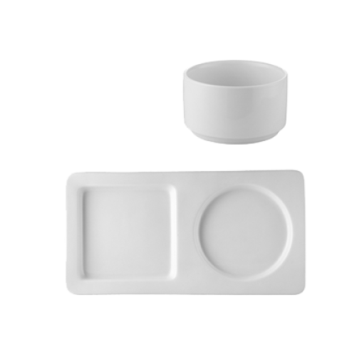 Soup & Salad Bowl Platter Set, two-piece, includes: (1) 28 oz., 5-3/8" dia. x 3"H, round, stackable bowl (SNS-B28) and (1) 12-3/4" x 6-1/2" x 7/8", rectangular platter, with (1) square and (1) circular well, dishwasher, oven and microwave safe, porcelain, Super White (Sold by case)