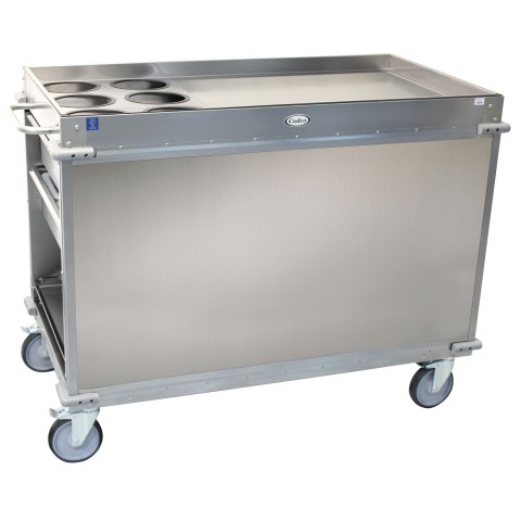 MobileServ® Beverage Cart, large, (6) airpot wells, space on top for condiments & extra beverages, (2) shelf & (4) drawers, (2) drink drawers each contain (2) 9.4 qt clear polycarbonate pans & (2) Cambro® #20PPD drain shelves, rubber bumpers on all corners of the cart, casters (2 with brakes, 2 with directional locks), stainless steel, UL EPH, Made in USA