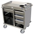 MobileServ® Beverage Cart, back-loading, (3) airpot wells, space on top for condiments & extra beverages, (2) shelves & (4) drawers, (2) drink drawers each contain (2) 9.4 qt clear polycarbonate pans & (2) Cambro® #20PPD drain shelves, rubber bumpers on all corners of the cart, casters (2 with brakes, 2 with directional locks), stainless steel, UL EPH, Made in USA