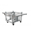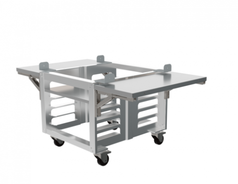 Oven Stand, half size, mobile, heavy-duty, open base with pan rack slides, holds (5) half-size sheet pans (not included), 12” flip up shelves, aluminum, silent casters (2 with brakes, 2 with directional locks), ships assembled, fits (2) half size Cadco ovens