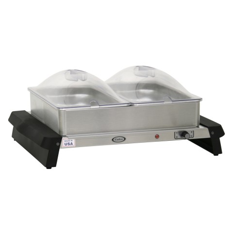 Double Buffet Server, countertop, 13-1/8" x 14" warming zone, holds (2) third size steam table pan, (2) clear polycarbonate lids with utensil slots, adjustable snap-action thermostat, 155°-205°F temperature range, safety signal light, cool-touch handles, includes (1) removable stainless pan holder, stainless steel construction, non-skid feet, 120v/60/1-ph, 2.5 amps, 300 watts, NEMA 5-15P, UL, cUL, Made in USA