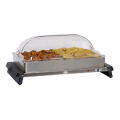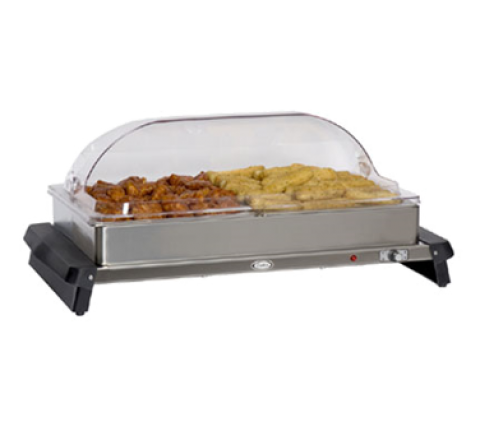 Double Buffet Server, countertop, 20-1/2" x 14" warming zone, holds (2) half size steam table pans (included), (1) clear Eastman Tritan™ copolyester rolltop lid with metal hinges, adjustable snap-action thermostat, 155°-205°F temperature range, safety signal light, cool-touch handles, includes (1) removable stainless pan holder, stainless steel construction, non-skid feet, 120v/60/1-ph, 2.5 amps, 300 watts, NEMA 5-15P, UL, Made in USA