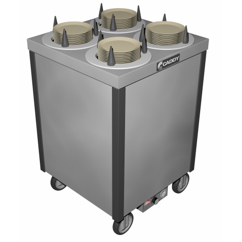Caddy Magic Dish Dispenser, cabinet style, heated, (4) self-leveling adjustable dispensing cylinders, approximate dish size 5-7/8" to 7-1/4" dia., stainless steel top, plastic corner bumpers, stainless steel electric control box, on/off switch, 4" swivel casters (2 with brakes), ETLus, NSF