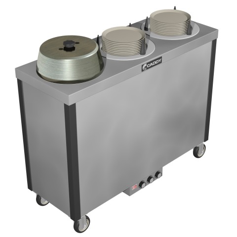 Caddy Magic Dish Dispenser, cabinet style, "super heater", slim line, (3) self-leveling adjustable dispensing cylinders, for up to 9-1/2" dia., stainless steel top, plastic corner bumpers, stainless steel electric control box, on/off switch, 4" swivel casters (2 with brakes), ETLus, NSF