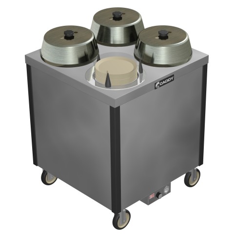 Caddy Magic Dish Dispenser, cabinet style, "super heater", (4) self-leveling adjustable dispensing cylinders, for up to 9-1/2" dia., stainless steel top, plastic corner bumpers, stainless steel electric control box, on/off switch, 4" swivel casters (2 with brakes), ETLus, NSF
