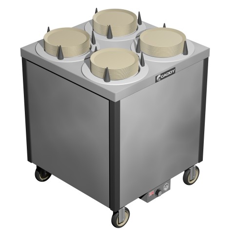 Caddy Magic Dish Dispenser, cabinet style, heated, (4) self-leveling adjustable dispensing cylinders, approximate dish size 9-5/8" to 10-1/8" dia., stainless steel top, plastic corner bumpers, stainless steel electric control box, on/off switch, 4" swivel casters (2 with brakes), ETLus, NSF