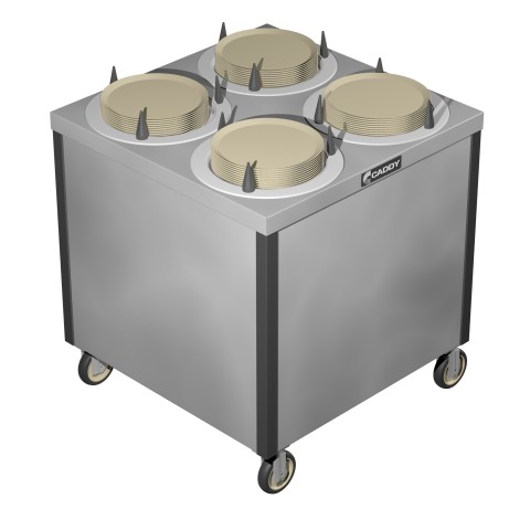 Caddy Magic Dish Dispenser, cabinet style, unheated, (4) self-leveling adjustable dispensing cylinders, approximate dish size 10-1/4" to 12" dia., stainless steel top, plastic corner bumpers, 4" swivel casters, NSF