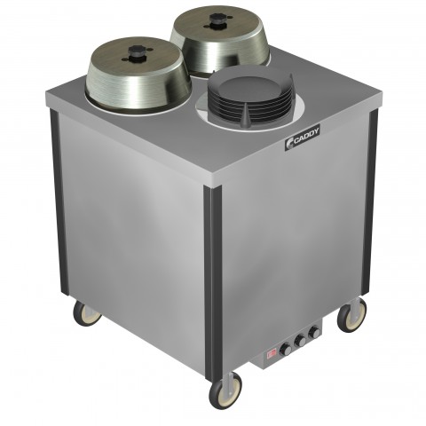Caddy Magic Underliner/Base Dispenser, cabinet style, "hi-heat", staggered, (3) self-leveling adjustable dispensing cylinders, for up to 9-1/4" dia., stainless steel top, plastic corner bumpers, individual automatic dial control for each cylinder, 5" swivel casters (2 with brakes), ETLus, NSF