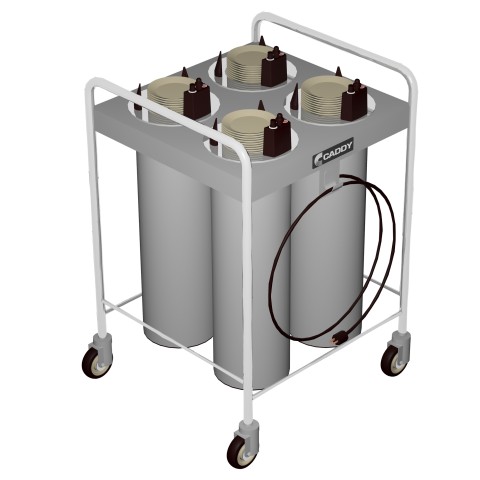 Caddy Magic Dish Dispenser, open style, heated, (4) self-leveling adjustable dispensing cylinders, approximate dish size 0" to 5-3/4" dia., reinforced stainless steel top, welded stainless steel tubular frame, stainless steel electric box, on/off switch, adjustable thermostat, 4" swivel casters (2 with brakes), 120v/60/1-ph, 11.6 amps, 1400 watts, NEMA 5-15P, ETLus, NSF