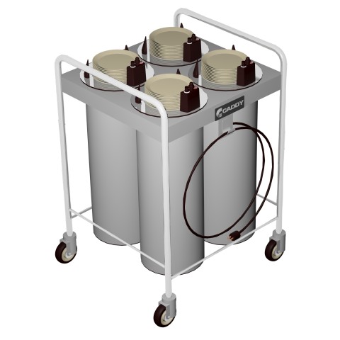 Caddy Magic Dish Dispenser, open style, heated, (4) self-leveling adjustable dispensing cylinders, approximate dish size 5-7/8" to 7-1/4" dia., reinforced stainless steel top, welded stainless steel tubular frame, stainless steel electric box, on/off switch, adjustable thermostat, 4" swivel casters (2 with brakes), 120v/60/1-ph, 16.6 amps, 2000 watts, NEMA 5-20P, ETLus, NSF