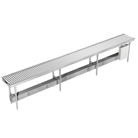 Tray Make-Up Conveyor, custom length per spec, non-powered roller conveyor, 1-1/4" plastic rollers with stainless steel balls in nylon bearings on 3" centers accommodates trays up to 16" wide (provide tray size), raised curbing, solid pan, tubular stainless steel legs with adjustable bullet feet, stainless steel construction ETLus, NSF (contact factory for price)
