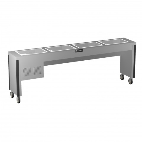 Cold Pan Unit, electric, slimline,99"W x 18"D x 34-1/2"H,open base, (4) 12" x 20" openings (12" front to back), stainless steel construction, vertical corner bumpers, 4" heavy duty swivel casters (2 with brakes), 120v/60/1-ph, 5.8 amps, 1/4 hp, self-contained refrigeration, cord with plug, NEMA 5-15P, ETLus, NSF (contact factory for price)
