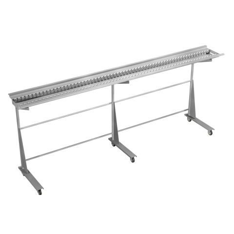 Tray Make-Up Conveyor, mobile, adjustable height, custom length per spec, non-powered skate-wheel conveyor, 1.9" dia. plastic wheels with stainless steel ball bearings, raised curbing, stainless steel solid pan for flat bottom trays up to 16" wide (provide tray size), cantilevered support brackets, 4" swivel casters (2 with brakes), ETLus, NSF (contact factory for price)