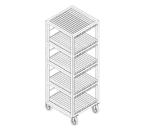 Vertical Tray Drying Rack, mobile, for correctional use, 24"W x 24"D x 70"H, (4) shelves, (14) tray slides per shelf, holds up to (112) trays, stainless steel construction, (2) 5" heavy duty polyurethane swivel casters & (2) fixed casters (contact factory for price)