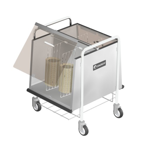 Cup & Saucer Caddy, 25-3/4"W x 26-1/4"D x 30"H, double sided, unheated, enclosed with hinged folding acrylic cover, wire shelf under for tray storage, capacity saucers (240) or cups (112), welded stainless steel construction, continuous neoprene bumper, 4" swivel casters, NSF