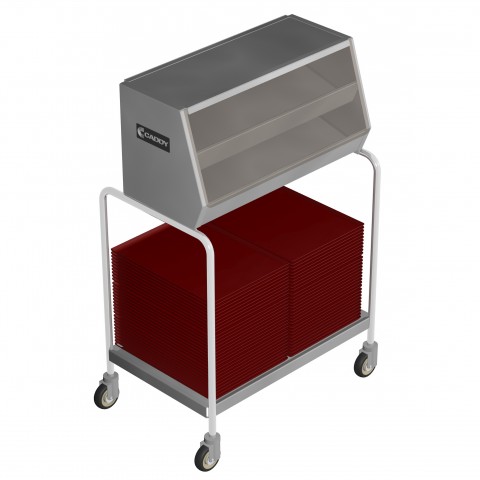 Tray & Silver Caddy, double tier, 34-1/2"W x 22-1/2"D x 50-1/4"H, cutlery housing with front & back folding plastic covers, (8) removable stainless steel pans each 11-1/2" x 6" x 4" deep, shelf capacity (190) trays up to 15" x 20", welded stainless steel construction, 4" swivel casters, NSF