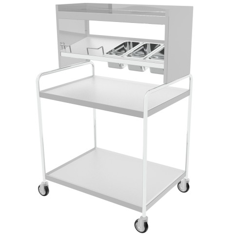 Tray Starter Caddy, 38"W x 26"D x 52"H, (2) shelves, (2) overhead shelves, lower shelf tilted with (3) cutouts & stainless steel pans (all 1/3 size), raised retainer rails for place mats, stainless steel construction, 4" swivel casters (2 with brakes), NSF