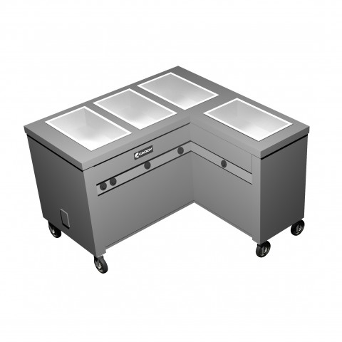 Hot Food Caddy, electric, enclosed heated base, (4) 12" x 20" x 6-3/8" deep hot food wells, L-shaped, right-hand, insulated wells with individual heat controls, (3) compartments accommodate (12) full size 2-1/2" deep pans, stainless steel construction, vertical corner bumpers, 4" swivel casters (2 with brakes), ETLus, NSF