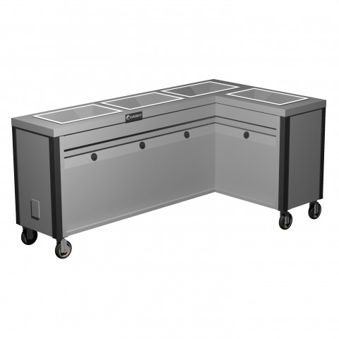 Hot Food Caddy, electric, slimline, enclosed heated base, (4) 12" x 20" x 6-3/8" deep hot food wells, L-shaped, right-hand insulated wells with individual heat controls, (3) compartments accommodate (12) full size 2-1/2" deep pans, stainless steel construction, vertical corner bumpers, 4" swivel casters (2 with brakes), ETLus, NSF
