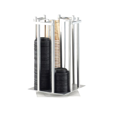 Cup/Lid Organizer, 10"W x 10"D x 15-3/4"H, (4) section, revolving, accommodates cups/lids up to 3.75" dia., metal, silver