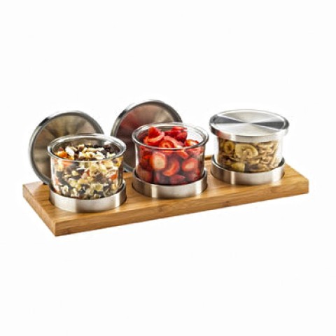 Cold Condiment Display, 16"W x 6"D x 4"H, (3) 16 oz. round glass jars with silicone lined stainless steel solid lids, cooling pucks, rectangular bamboo base