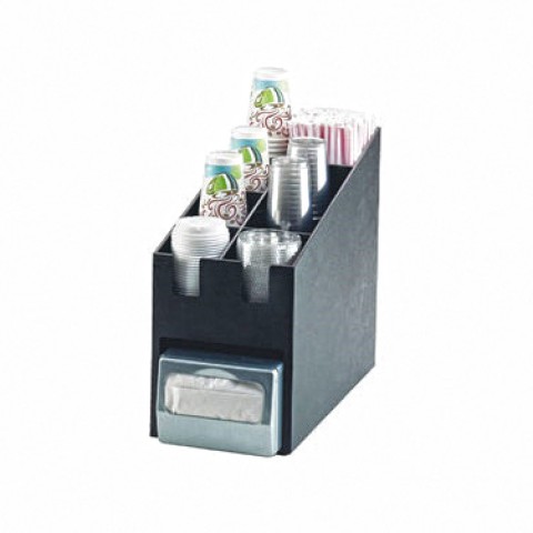 Classic Condiment Organizer, 9-1/4"W x 19-1/4"D x 16-1/2"H, (8) section for cup/lid/straw up to 4" dia., adjustable dividers, with napkin dispenser slot, plastic, black (napkin dispenser not included)