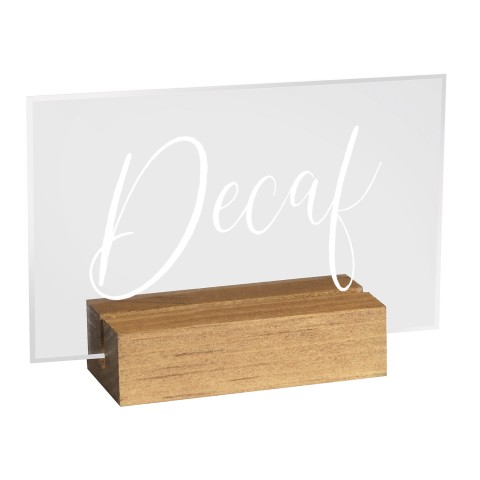Madera Sign, "Decaf", 3-1/2" x 1" x 2-1/2", crystal acrylic signage with bright white modern font, rustic pine wood base