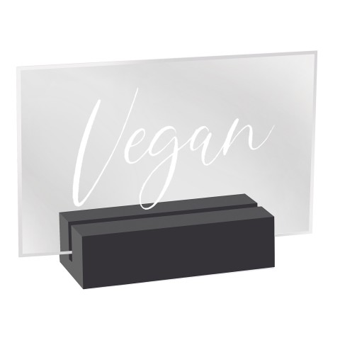 Sign, "Vegan", 3-1/2" x 1" x 2-1/2", crystal acrylic signage with bright white modern font, black wood base
