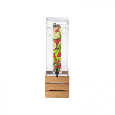 Beverage Dispenser, 3 gallon capacity, 8"W x 8"D x 25-1/2"H, single, square, infusion chamber, lid, spigot, clear acrylic body, bamboo crate stand, BPA Free