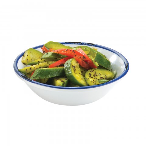 Bowl, 4-1/2" dia., x 1-1/4"H round, white melamine with blue rim, enamel
