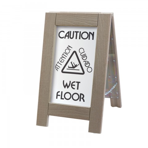 Outdoor "Wet Floor" Sign, 12"W x 17-1/2"D x 22"H, double-sided, (2) silver metal caution plates, bilingual, chain stop, composite frame