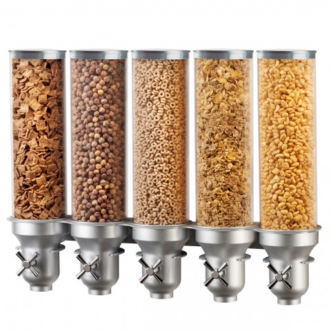 Cereal Dispenser, (5) 4.5L capacity, 27-1/2"W x 6-1/2"D x 21-3/4"H, wall-mountable, 6-wing turn & serve mechanism (hardware not included)