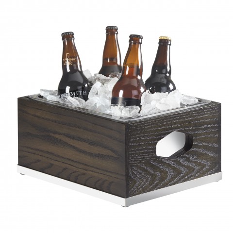 Cinderwood Ice housing, 13-1/4"W x 11"D x 7-1/4"H OAL, rectangular, includes: clear polycarbonate pan & condensation liner, geometric end cutouts, mirrored base & trim, oak wood, dark ash gray, BPA Free