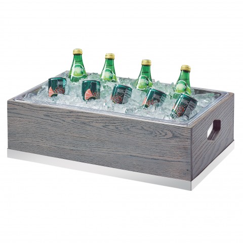 Ashwood Ice Housing, 21-1/4"W x 13-1/4"D x 7"H, rectangular, includes clear polycarbonate pan insert and liner, geometric end cutouts, mirrored base trim, oak wood, gray wash