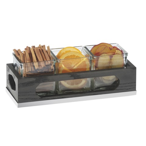 Cinderwood Jar Holder Tray, 12-3/4"W x 5"D x 5-1/8"H, rectangular, (3) glass jars included, geometric end cutouts, oak wood, dark gray, BPA Free