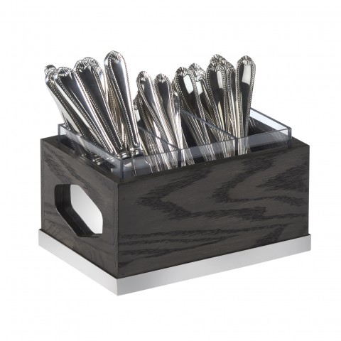 Cinderwood Flatware Holder, 9-1/2"W x 6-3/4"D x 4-3/4"H, rectangular, (3) section, removable plastic insert, geometric end cutouts, oak wood, dark ash gray, BPA Free