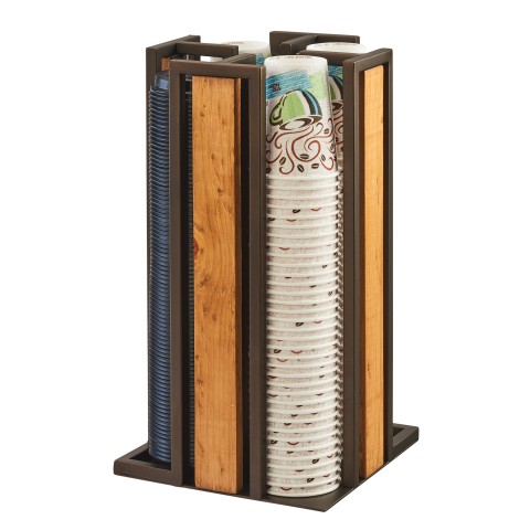 Sierra Cup/Lid Organizer, 9-1/4"W x 9-1/4"D x 18"H, (4) section, revolving, accommodates cups/lids up to 3-3/4" dia., rustic pine, metal frame, bronze finish