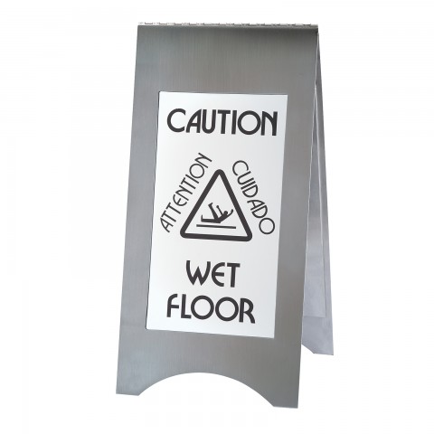 "Wet Floor" Sign, 11-7/8"W x 17-1/2"D x 22"H, double side, bilingual, (2) silver caution sign plates, hinged stop, stainless steel