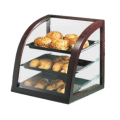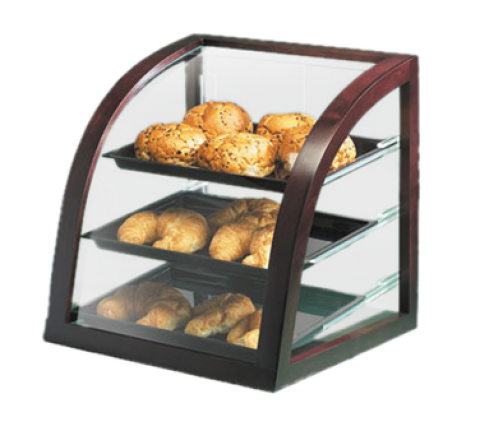 Westport Display Case, 17"W x 17"D 18"H, 3-tier, attendant serve, non-refrigerated, countertop, Euro sloped front, rear door, see-thru design, (3) 10" x 14" (335-10-13) black trays, acrylic body, dark wood frame, BPA Free (UPS Oversize 1)