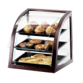 Westport Display Case, 17"W x 17"D x 18"H, 3-tier, self serve, non-refrigerated, countertop, Euro sloped front, single top hinged front door with knob, (3) 10" x 14" (335-10-13) black trays, acrylic body, dark wood frame, BPA Free