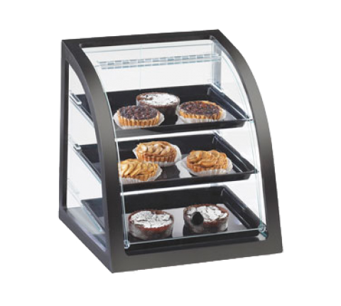 Midnight Bamboo Display Case, 17"W x 17"D x 18"H, 3-tier, self serve, non-refrigerated, countertop, Euro sloped front, single top hinged front door, (3) 10" x 14" (335-10-13) black trays, acrylic body frame, BPA Free