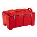 Camcarrier®, top loading, holds (1) GN full size or fractional pans up to 8" deep, approximate capacity 40 qt., retention: hot for up to 4 hours (190° - 179° F) & cold for up to 4 hours (33.9° - 35.8° F), (2) molded-in handles, (6) recessed stainless steel latches, removable gasket, passive vent slot, dishwasher safe, scratch resistant textured exterior, one-piece seamless, double wall, polyurethane foam insulation, polyethylene construction, hot red, NSF