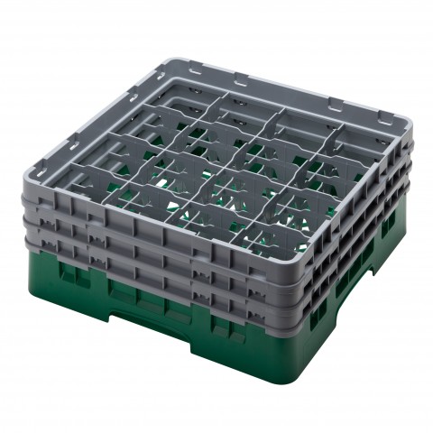 Camrack® Glass Rack, with (3) soft gray extenders, full size, 19-3/4" x 19-3/4" x 8-7/8", (16) compartments, 4-3/8" max. dia., 6-7/8" max. height, Sherwood green, HACCP compliant, NSF
