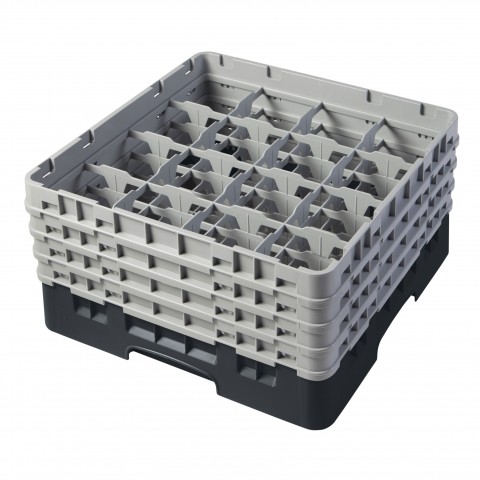 Camrack® Glass Rack, with (4) soft gray extenders, full size, 19-3/4" x 19-3/4" x 10-1/2", (16) compartments, 4-3/8" max. dia., 8-1/2" max. height, black, HACCP compliant, NSF, Made in USA