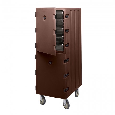 Camcart®, double cavity for food storage boxes, 33-1/4"L x 21-1/2"D x 64"H, (26) support rails on 1-3/4" centers, polyethylene, foam insulation, molded-in handle, (4) 6" casters (2 fixed, 2 swivel, 1 with brake), dark brown, NSF, Made in USA