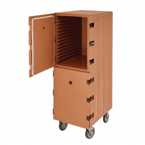 Camcart®, double cavity for food storage boxes, 33-1/4"L x 21-1/2"D x 64"H, (26) support rails on 1-3/4" centers, polyethylene, foam insulation, molded-in handle, (4) 6" casters (2 fixed, 2 swivel, 1 with brake), coffee beige, NSF, Made in USA
