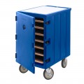 Camcart®, for trays & sheet pans, 3" clearance between trays, with removable cutting board on top, holds up to (7) 18"x 26" trays or sheet/bun pans, (7) tray supports on 3-3/4" centers, 32"L x 21-1/2"D x 37-1/2"H, (4) 6" casters (2 fixed, 2 swivel, 1 with brake), navy blue, NSF, Made in USA